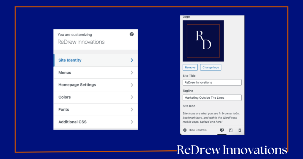 By selecting the appearance tab on your dashboard and choosing customize, you’re able to change your site identity. Here you can change your logo, site title, tagline, and site icon