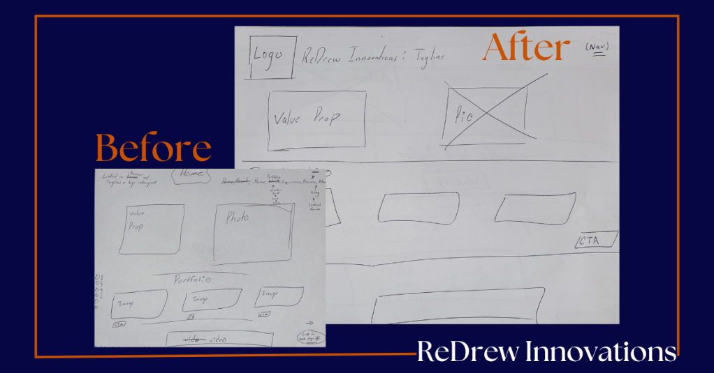 The next step is to create a wireframe. A wireframe is an outline of what your website will look like. It will help to get your ideas out, and create consistency across your pages. I recommend building a wireframe on paper as well as a digital copy. Here is what my wireframes look like. I have multiple versions of my wireframes, bettering each design as my vision becomes clearer.