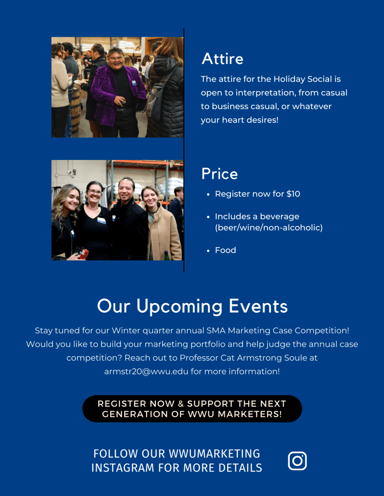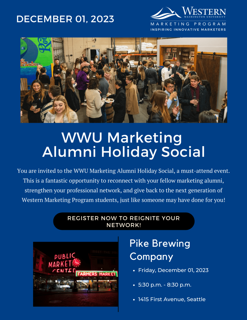 The Western Washington University Marketing Program Career Launch & Alumni Holiday Social is an annual event designed to connect current marketing students with alumni and industry professionals. This dual-purpose gathering consists of two main components: the Career Launch and the Holiday Mixer.