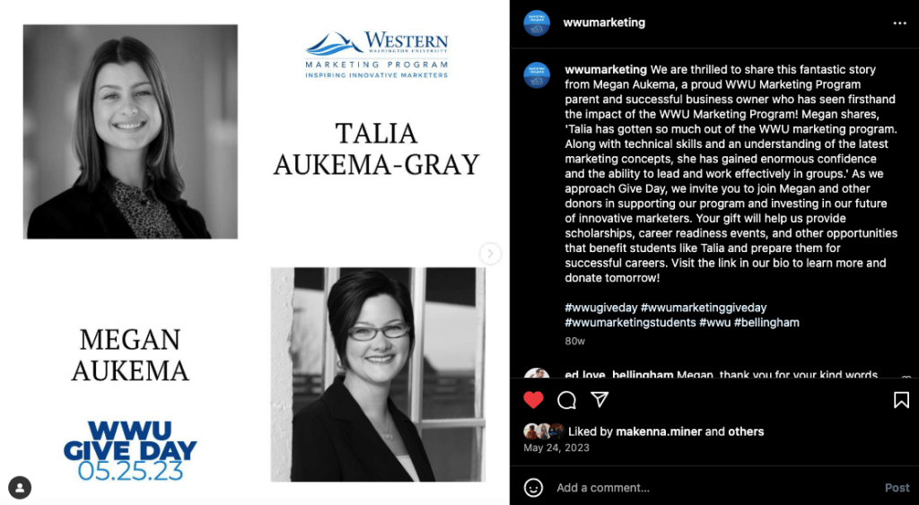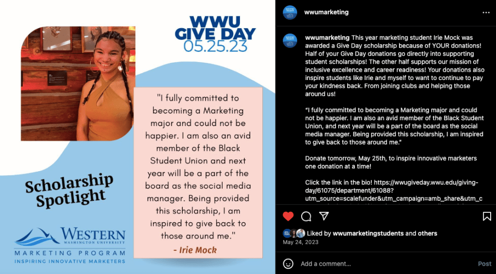 Social media content including scholarship spotlights, student ambassador highlights, donor recognition, and personal stories from students and parents in the Marketing Program to drive engagement and support for the WWU Give Day Campaign.
