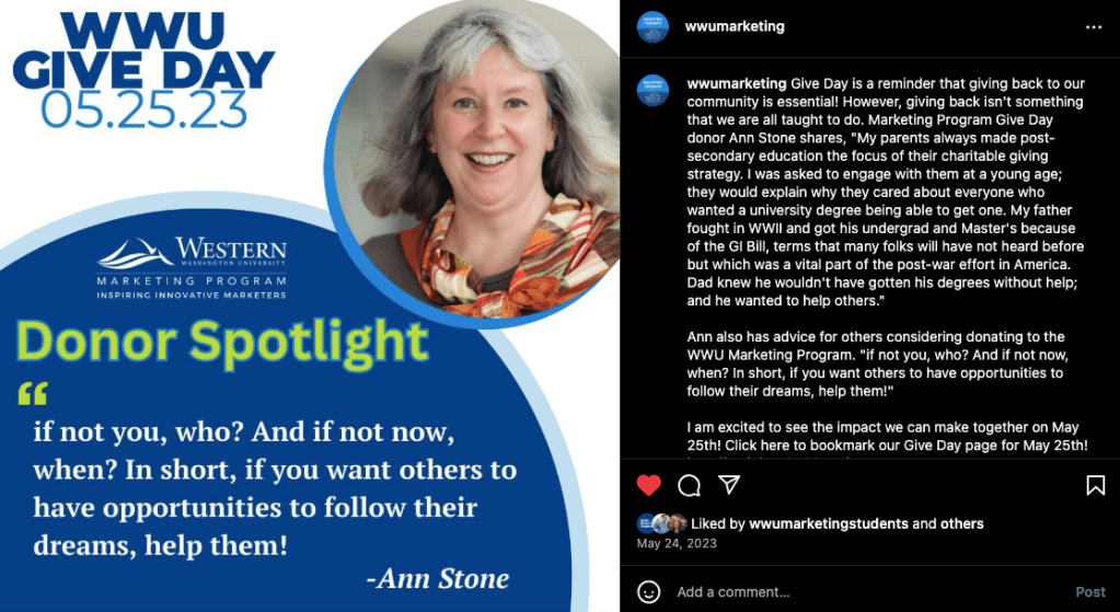 As part of the WWU Marketing Program Give Day Campaign, I developed a strategic alumni engagement initiative focused on storytelling and community connection. I personally reached out to alumni to conduct interviews and created social media content that highlighted their professional journeys, memorable experiences, and the lasting impact of the Marketing Program.