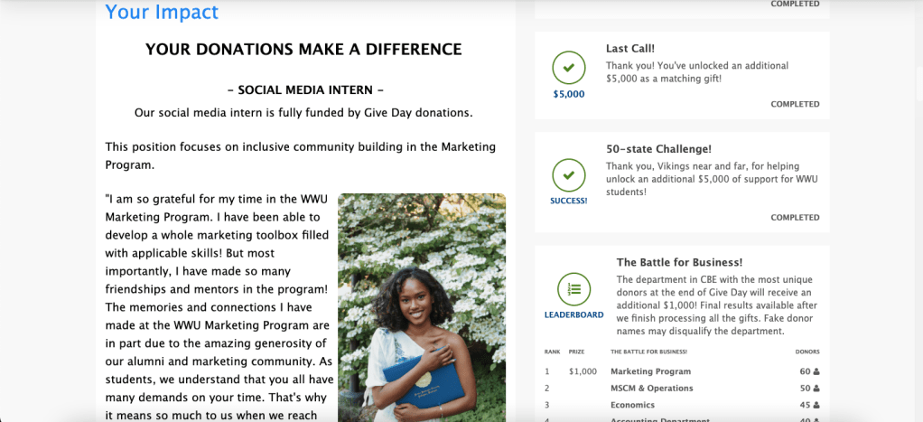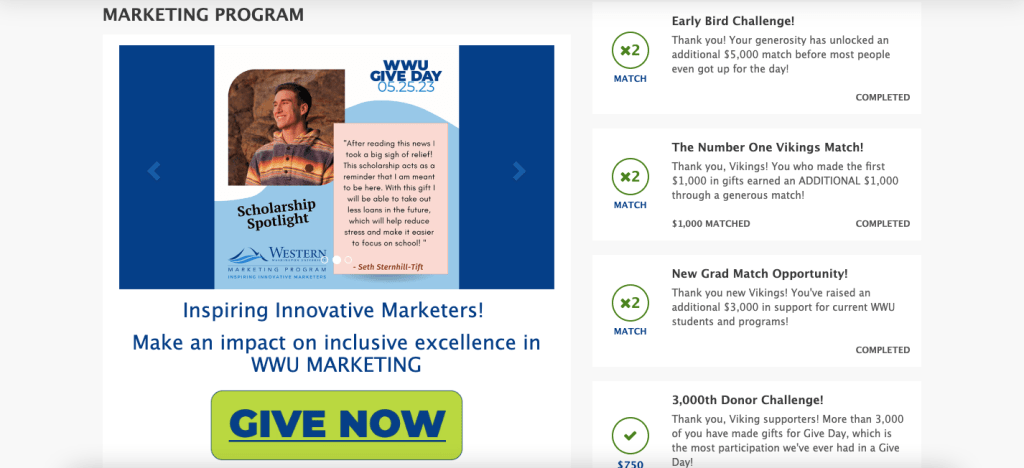 The WWU Give Day Campaign ia an annual 24-hour fundraising initiative organized by Western Washington University (WWU) to support various departments, programs, and scholarships across the campus. Scheduled for May 25, 2023, the event encouraged alumni, friends, faculty, staff, and community members to contribute to the WWU funds that inspired them most.